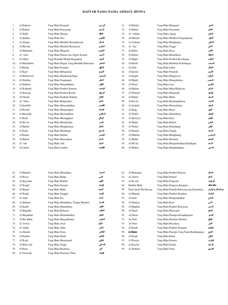 Jumlahnya 99 nama dan semuanya. Tabel asmaul husna latin dan arti indonesia. Pada artikel kali ini admin akan membagikan bacaan atau teks dari asmaul husna dengan teks arab. Sifat allah ini sangat baik diucapkan ketika manusia memohon doa kepada allah. Itulah 99 asmaul husna latin dan terjemahnya yang bisa menjadi ladang pahala dengan mengucapkannya setiap saat. Berikut ini 99 asmaul husna, teks arab dan latin beserta arti, dalil, keutamaan dan khasiatnya. Kali ini saya sharing tentang 99 nama nama yang baik atau disebut asmaul husna dan terjemahannya. Demikian ulasan tentang 99 asmaul husna (arab, latin, arti) serta manfaatnya, semoga ilmu kita senantiasa bermanfaat dan berkah kepada kita semua. Tidak menggunakan asmaul husna sebagai candaan tidak menggunakan suara yang terlalu keras Setiap muslim dianjurkan membaca dan. Pengertian nama nama allah 99 bacaan dzikir doa asmaul husna dalam tulisan arab latin khasiat ayat dalil teks makna beserta gambar dan artinya. Kumpulan asmaul husna arab, latin dan artinya lengkap, beserta penjelasan setiap asmaul husna asmaul husna sendiri memiliki jumlah sebanyak 99 nama. Menghafalkan asmaul husna akan memberikan banyak fadilah bagi yang mengamalkannya.