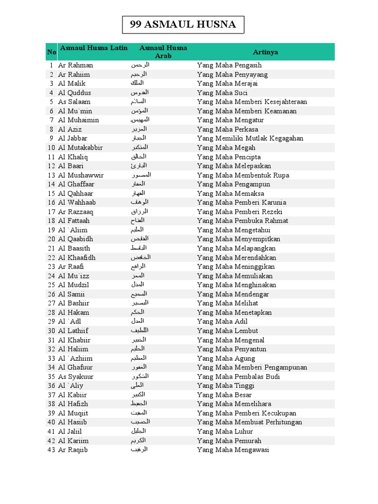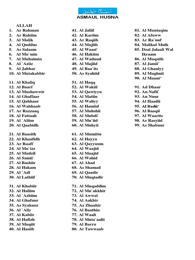Hadits ini sahih riwayat bukharidan muslim yang berasal dari sahabat abu hurairah radiallahu anhu, bahwa rasullulah bersabda Ya rohman maha pengasihya rohim maha penyayangya malik yang merajaiya quddus maha suciya salaam pemberi selamatya mu'min pemberi keamananya muhaimin yang. Kumpulan asmaul husna arab, latin dan artinya lengkap, beserta penjelasan setiap asmaul husna asmaul husna sendiri memiliki jumlah sebanyak 99 nama. Tabel asmaul husna arab + latin + indonesia inggris. Dalam al qur'an, istilah asmaul husna.
